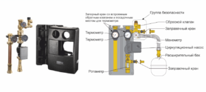 Группа безопасности, в состав которой входят клапан сброса давления и манометр для визуального контроля давления в системе. Так же к группе безопасности подключается расширительный бак для компенсации чрезмерного давления возникающее при перегреве системы. Максимальное давление не должно превышать 6 бар. Если давление в системе становится слишком высоким, клапан открывается и выпускает часть гликолевой смеси из гелиосистемы, стабилизируя давление.