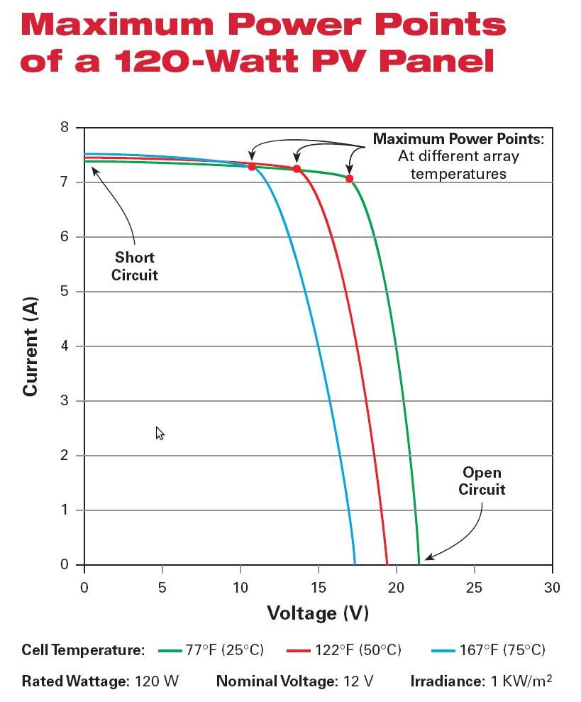 На рисунке показано, как может меняться напряжение в точке максимальной мощности при разных температурах солнечной панели. Чем горячее солнечный модуль, тем меньше напряжение на нём и, соответственно, выработка энергии солнечной батареей снижается. В какие-то моменты точка максимальной мощности может быть ниже напряжения на аккумуляторе, и в этом случае вы не получите никакого выигрыша в выработке энергии по сравнению с ШИМ контроллером. Такое же влияние оказывает и частичное затенение солнечной батареи.
