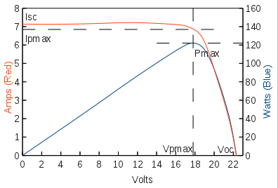 Глядя на типичную вольт-амперную характеристику солнечной батареи, можно увидеть, что производительность энергии может быть увеличена, если контроллер заряда будет следить за точкой максимальной мощности солнечной батареи MMP.