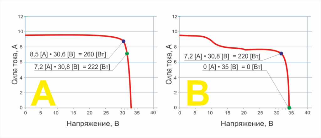 Каждый из незатененных модулей имеет вольт-амперную характеристику, как показано на графике A. В свою очередь, затененный модуль имеет вольт-амперную характеристику, как показано на графике B.