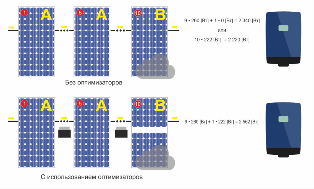 При использовании смарт-модулей с оптимизаторами мощности, затененный модуль будет генерировать 222 Вт, не влияя на хорошо освещенные модули, которые смогут генерировать 260 Вт каждый. Следовательно, вся система сможет генерировать 2562 Вт, что всего на 1,5% меньше номинальной мощности.