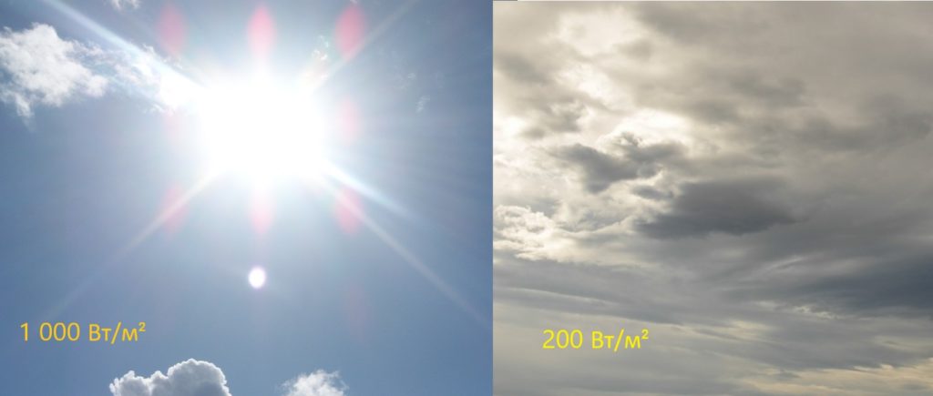 В дневное время солнечный свет достигает Земли в виде прямых солнечных лучей и рассеянного света в различных пропорциях. И зависит это от погодных явлений и широты местности. При ясном небе мощность солнечного излучения достигает 1000 Вт/м² и свет практически полностью состоит из прямых лучей, при пасмурной погоде мощность падает и стремится к 0 во время дождя и состоит в большей степени из рассеянного света. Однако солнечная инсоляция все же есть, и она может быть преобразована в электричество с помощью солнечной электростанции.