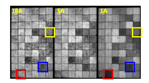 Как видно из графики сделанной при помощи электролюминесцентной подсветки, некоторые ячейки имеют значительное падение относительной эффективности в пасмурную погоду, при этом они могут иметь хорошую производительность в испытательных условиях при освещенности 1000 Вт/м2. Таким образом кроме падения производительности из-за снижения солнечной интенсивности, возможны так же и уменьшение КПД панели.