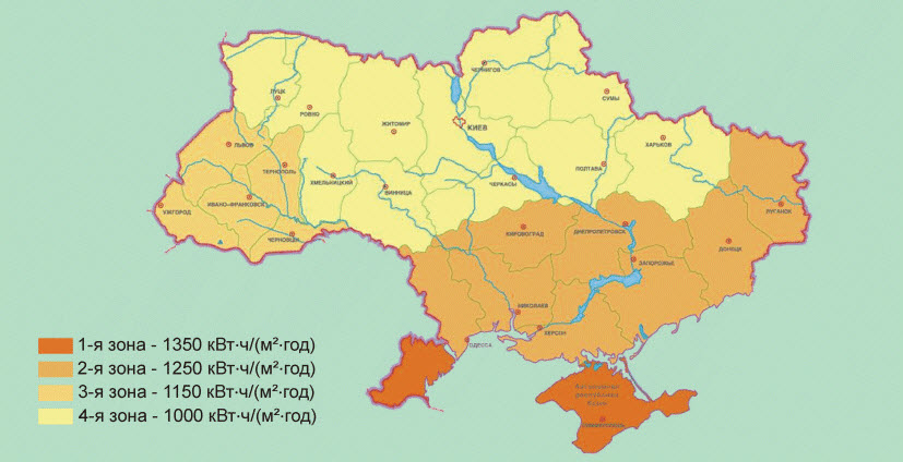 - I — интенсивность солнечного излучения, попадающее на поверхность Земли в горизонтальной плоскости. Значение можно выбрать, воспользовавшись картой интенсивности солнечной радиации за год:
