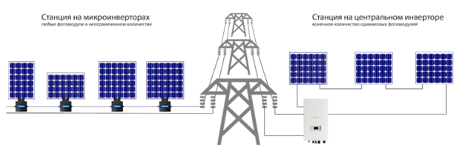 В отличие от распространенных центральных инверторов или моноинверторив, работающих с большим количеством солнечных панелей, объединенных последовательно, каждый микроинвертор работает с одной-двумя или четырьмя панелями. В то же время выходы переменного тока микроинверторив могут быть объединены между собой для формирования необходимой выходной мощности и подключение к сети общего пользования.