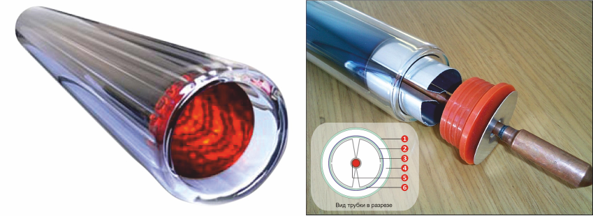 Наиболее популярные и продаваемые солнечные коллекторы имеют коаксиальные трубки. Самым важным элементом в этих трубках является поглощающий слой, наносимый на внешнюю сторону внутренней стенки трубки. Именно этот слой поглощает и передает тепло теплоносителю гелиосистемы при помощи специального оребрения.